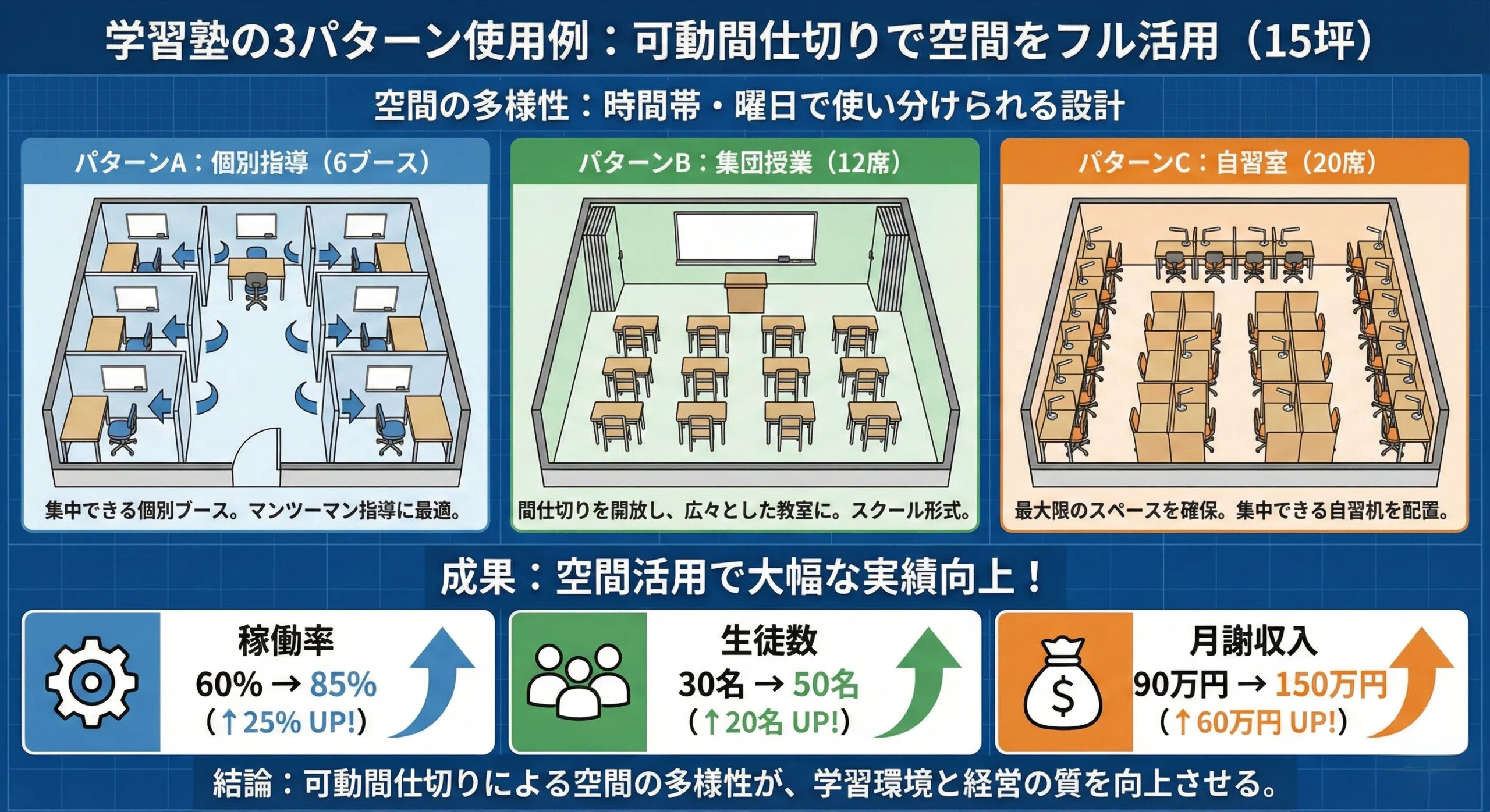 【実例⑤】15坪学習塾:可動間仕切りで3パターンの空間