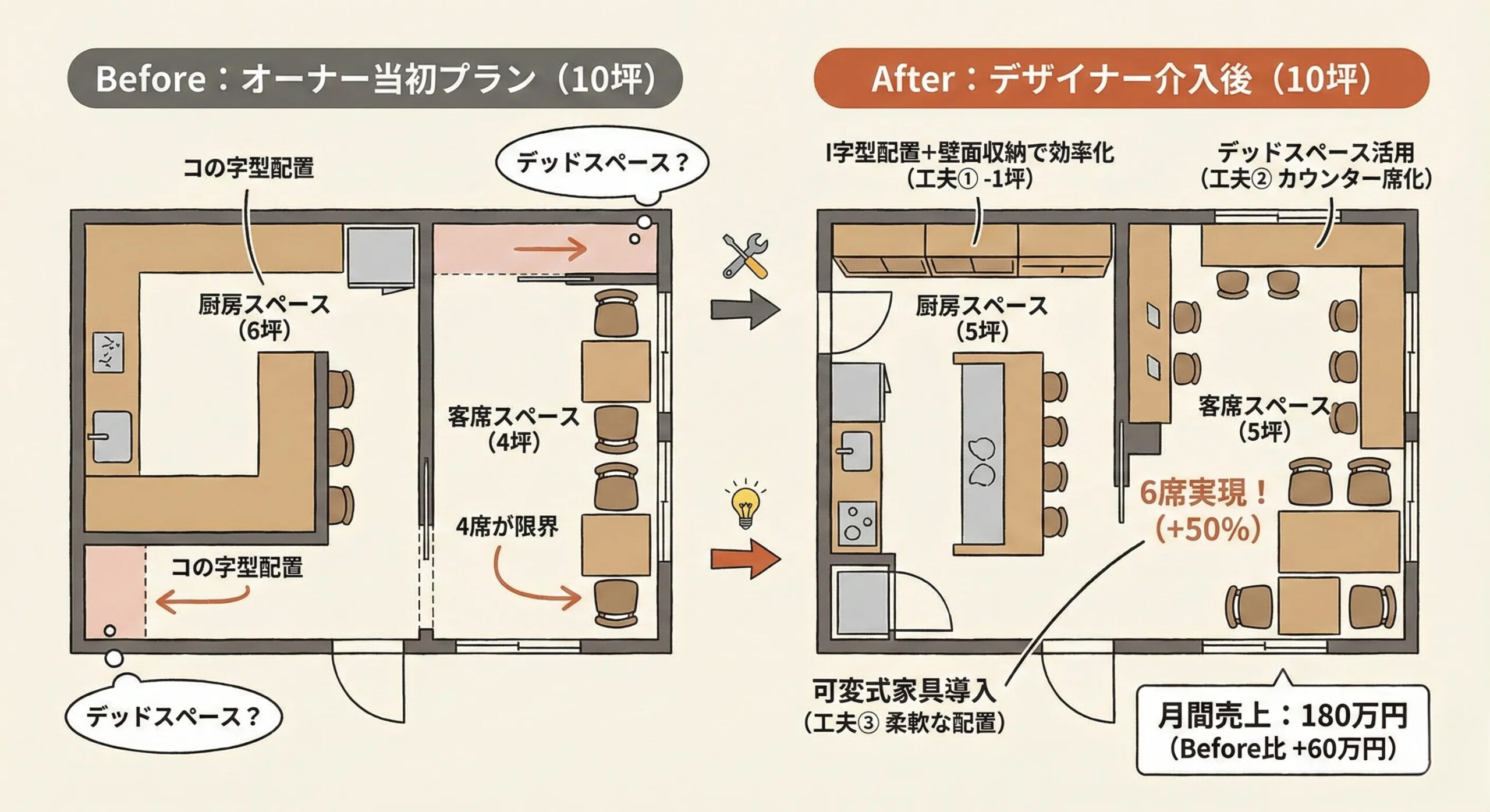 - 10坪で4席→6席、16坪で4席→6席+休憩所など、実例多数