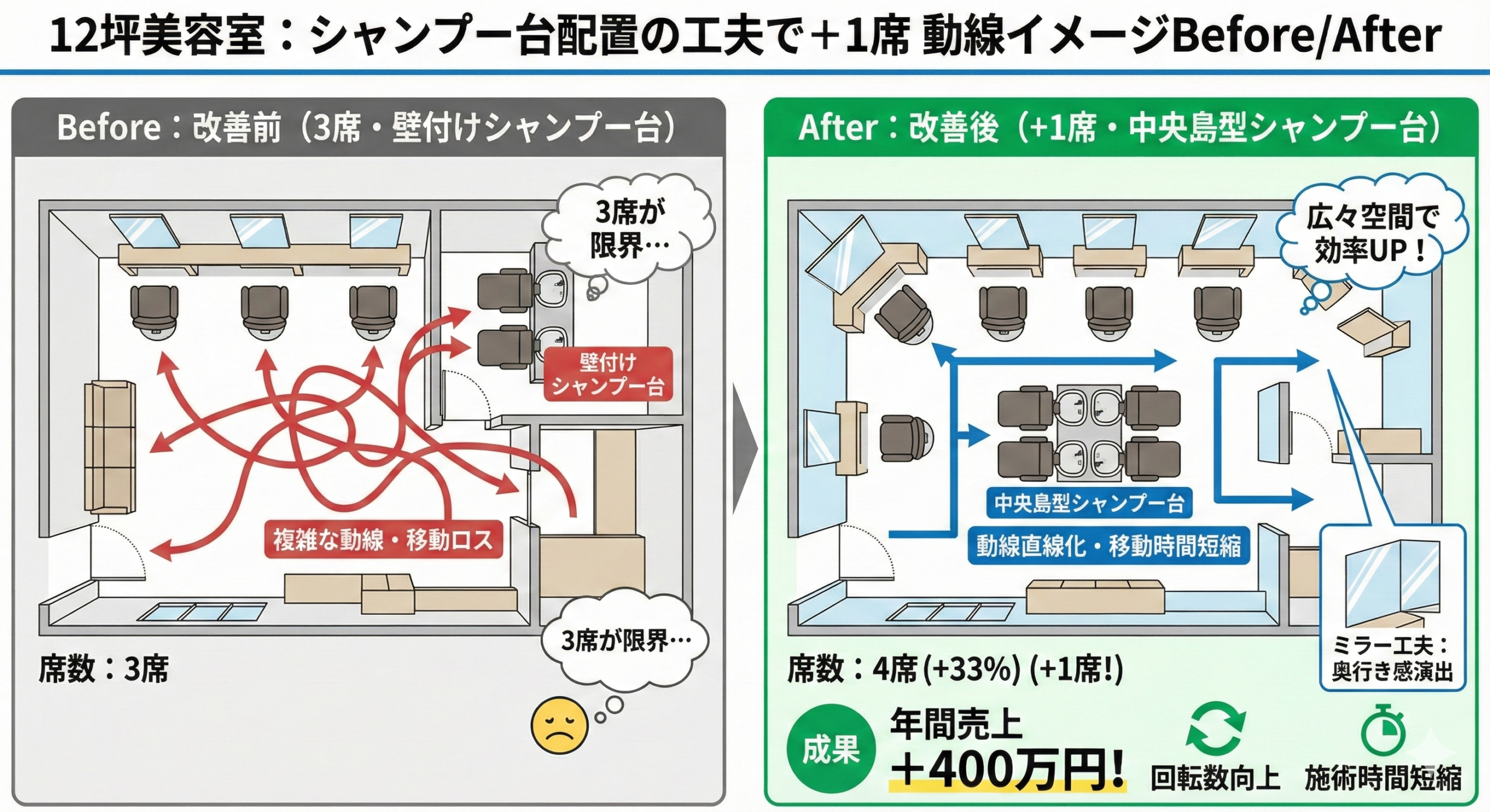【実例③】12坪美容室:シャンプー台配置の工夫で+1席