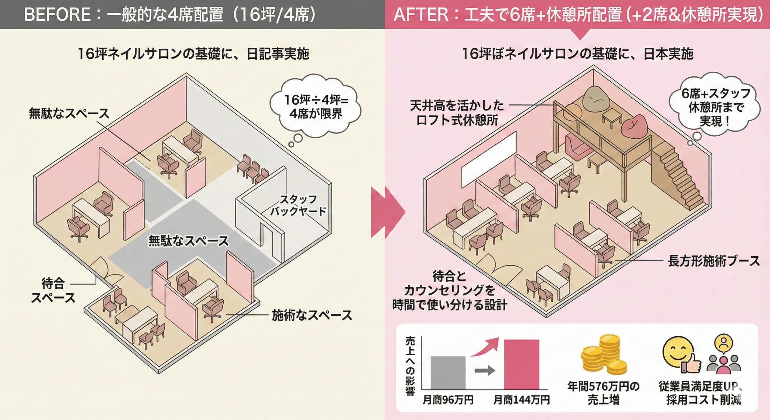【実例②】16坪ネイルサロン:4席→6席+スタッフ休憩所の奇跡